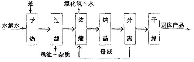 工藝說明:水解水首先予熱至沸騰。然后,將予熱后溶液過濾(采用真空過濾)除去溶液中殘油及其它雜質(zhì)。過濾后溶液濃縮至溶液表面有晶膜出現(xiàn)便停止加熱(濃縮終點溫度為124℃,粗測),使共自然結晶。將結晶體與母液分離(離心分離或真空抽濾),母液送回再次濃縮,固體包裝后即為結晶三氯化鋁產(chǎn)品?;?qū)饪s結晶后的固體產(chǎn)品經(jīng)與液液分離后,通入熱風進行干燥處理,包裝后即為產(chǎn)品。