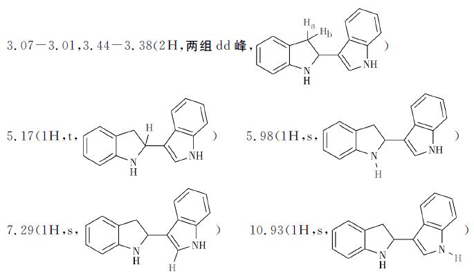 產(chǎn)物2b(5-methyl-3-(5-methylindolin-2-yl)- 1H-indole)1?。取。危停?(400 MHz,DMSO-d6)δppm:10.64 (s,1H),7.24(s,1H),7.16(d,J=8.0Hz,1H),7.10(s,1H),6.81(d,J=8.0Hz,1H),6.76(s, 1H),6.67(d,J=8.0Hz,1H),6.38(d,J=8.0Hz,1H),5.58(s,1H),4.98(t,J=8.0Hz,1H), 3.24-3.18(dd,J=8.0Hz,1H),2.90-2.84(dd,J=8.0Hz,1H),2.25(s,3H),2.09(s,3H);13C NMR(100MHz,DMSO-d6)δppm:149.86,135.21,128.68,127.26,126.61,126.02,125.30,124.97, 122.65,122.09,118.91,117.61,111.25,108.08,56.26,37.44,21.36,20.59.