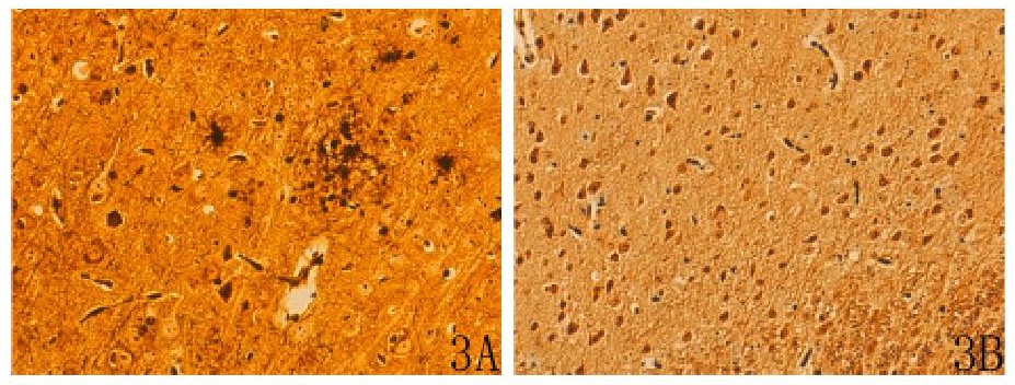 改良Bielschowsky氨銀液染色結(jié)果:AD模型組海馬CA2區(qū)可見錐體細胞排列不整齊、稀疏、萎縮、核固縮, 核周體內(nèi)棕黑色細絲增粗、呈小塊狀;軸突內(nèi)神經(jīng)元纖維模糊不清;神經(jīng)元外可見Aβ斑或老年斑, 體積較大、數(shù)量較多, 且周圍有浸潤的膠質(zhì)細胞及變性的神經(jīng)元 (圖3A) 。正常組海馬CA2區(qū)錐體細胞的細胞質(zhì)內(nèi), 可清晰地看到棕黑色的細絲狀結(jié)構(gòu)即神經(jīng)原纖維, 在核周體內(nèi)交織成網(wǎng), 并伸入樹突和軸突;神經(jīng)元外未見Aβ斑或老年斑 (圖3B) 。詳見圖3。